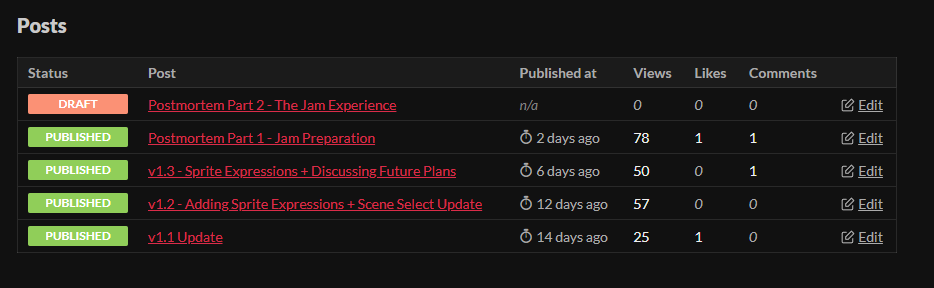 It isn't massive, but there was a period where downloads flatlined and views got very low. But right when I posted the first postmortem on the 13th, things seemed to jump. Also, if we look at the performance of all my devlogs: