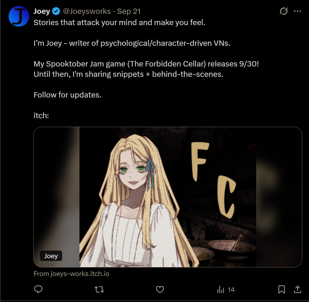 I still occasionally tweet about the game, but I'm not consistent. I need to eventually make a system, like draft 7 tweets every Sunday and schedule them out. I need to figure out what to post though. I'm also not trying to make a "Forbidden Cellar" Twitter, it's a "Me" account. But, I'll worry about this later. This is a postmortem, not a brainstorm.