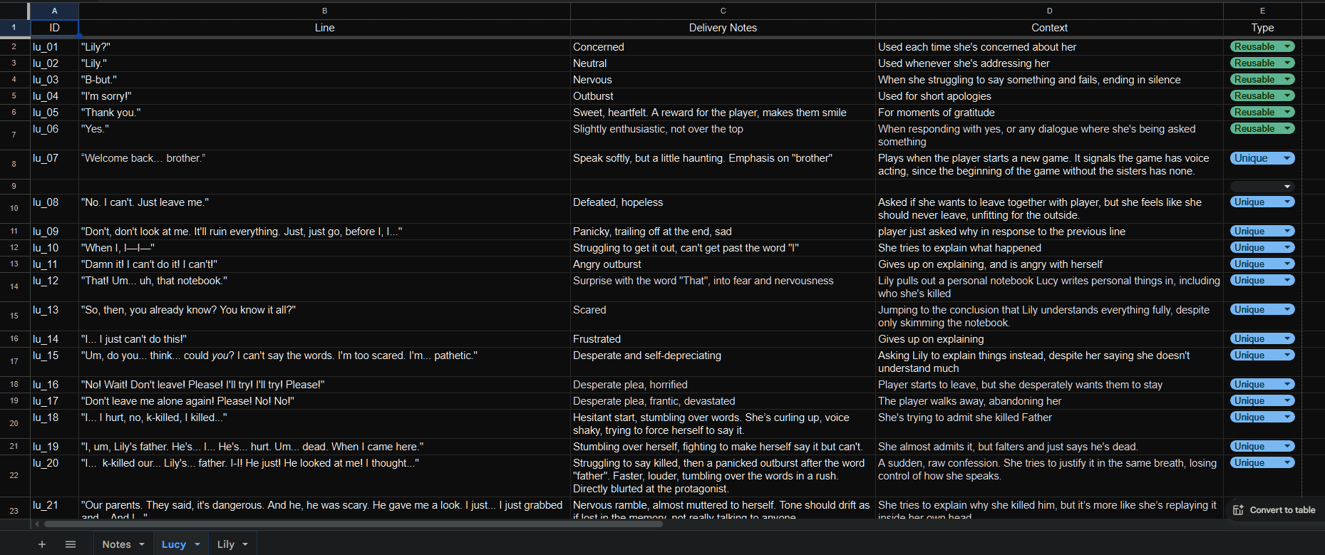 What I had to do for the doc, was pick out a line, write notes on the delivery, then the context around the line. It doesn't sound so bad, but it is surprisingly draining and time consuming. I also tagged the line IDs in the script at the same time, which made this take a little longer but now I can just drop the audio files in, then it just works. I don't regret that part.